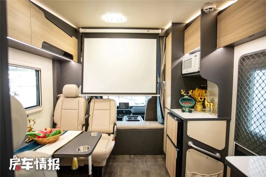 和上一款车型一样的是,这款新车也是提供了一前一后两个休息区,前方额头床的尺寸为2200*1400mm,采用抽拉式的设计,对于下方驾驶室可以提供更宽裕的头部空间,这样的设计取消了常见的位于床板下方的液晶电视,取而代之的是60寸的投影幕布,也可以打造一个小型的私人影院。
