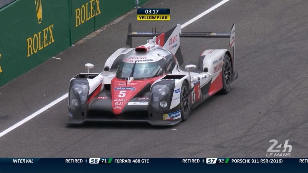 但在比赛即将结束之时,TR中突然传来了领先的丰田5号车驾驶员中岛一贵的"No Power",随后速度开始变慢,在比赛结束前倒数3分25秒时,领跑了23小时56分钟的丰田TS050 5号车停在了勒芒赛道的发车大直道上,而原先落后了一分多钟的保时捷919 2号赛车则开启了疯狂追车模式,在比赛结束前的3分22秒超越了丰田,成为了全场第一。
