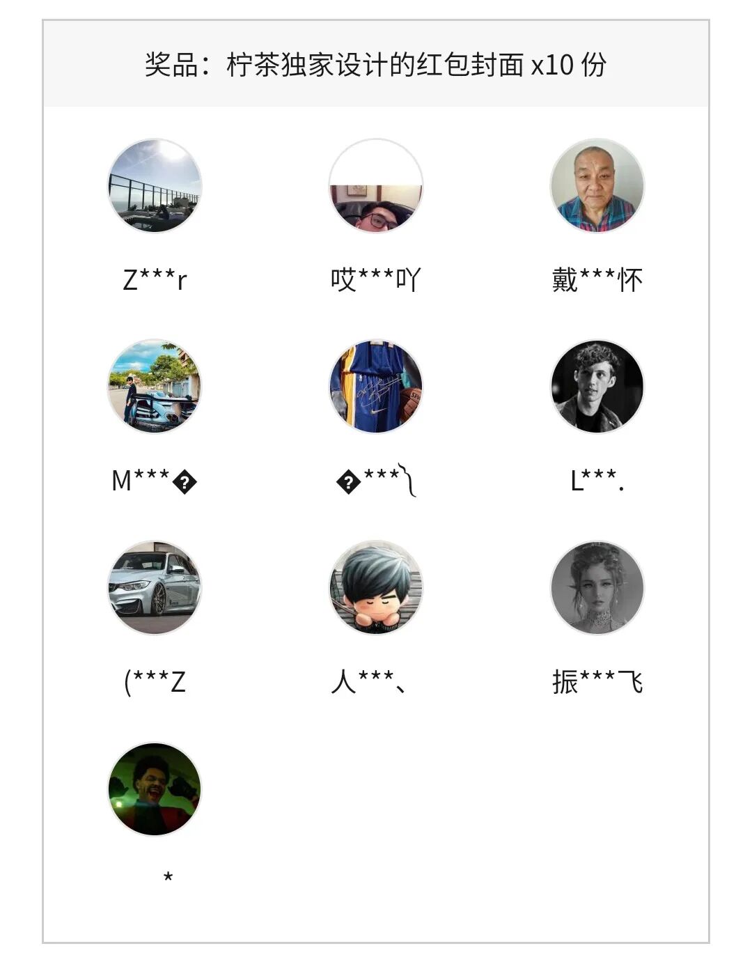 让我们恭喜这几位朋友,获得了我们柠茶团队送出的原创红包封面一份!请还未领奖的幸运儿凭中奖二维码联系我们!