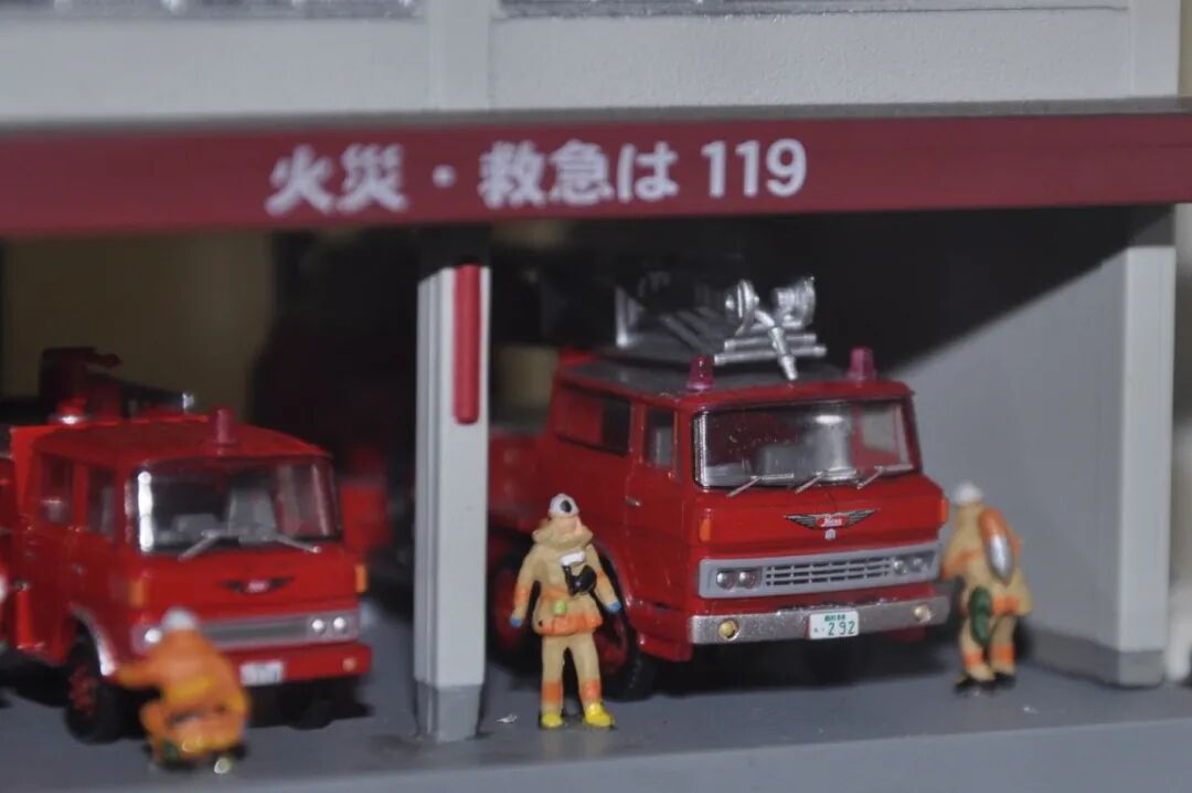 看这张图是在模拟日本的消防局的工作场景,但表现失误,因为左右两台小车的比例并不相同,一个大一个小,如果作者喜欢这种场景,建议购买同比例的设备做场景。我本人有1:18的消防车,您的照片似乎也是18的。顺便说一下,这种玩法的模型仿真度都不算高。