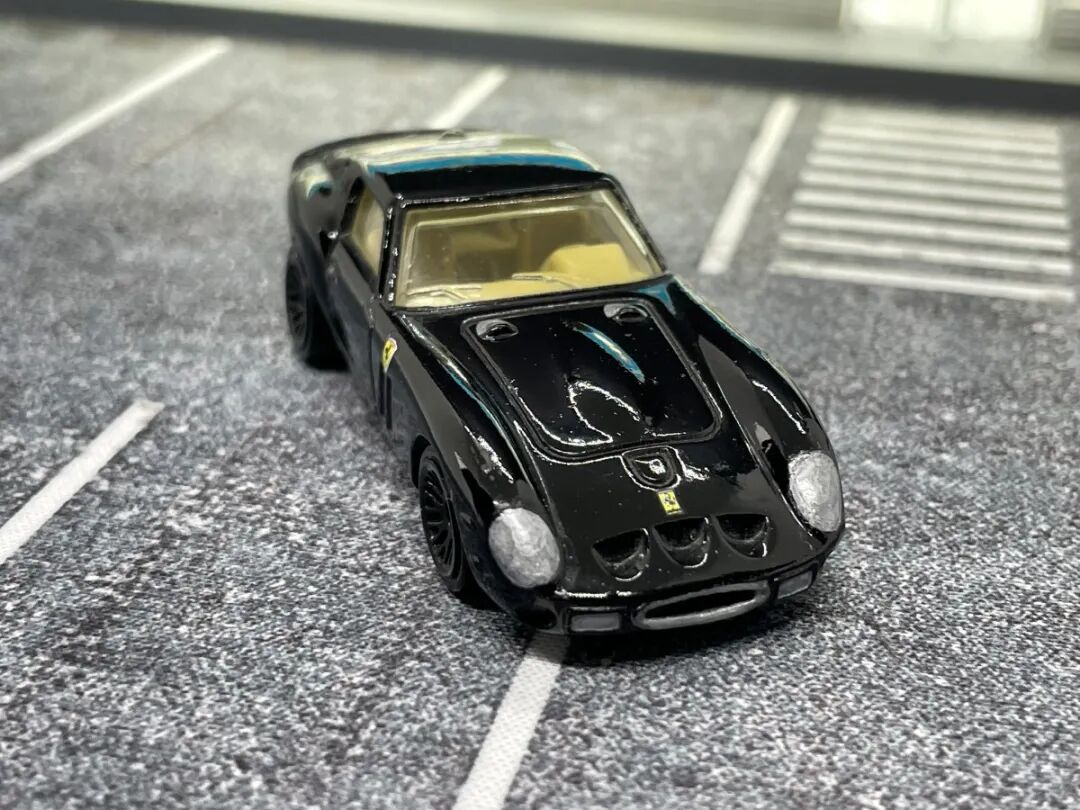 原来的法拉利标和盾徽被我用水贴覆盖了,而两侧的盾徽原车也是有移印的,不过车灯原车是没有上节操的,但这台车的模具精度非常棒,可以看到对于发动机盖的浮雕也还原的很到位,同时车窗也有雨刷器的刻画。
