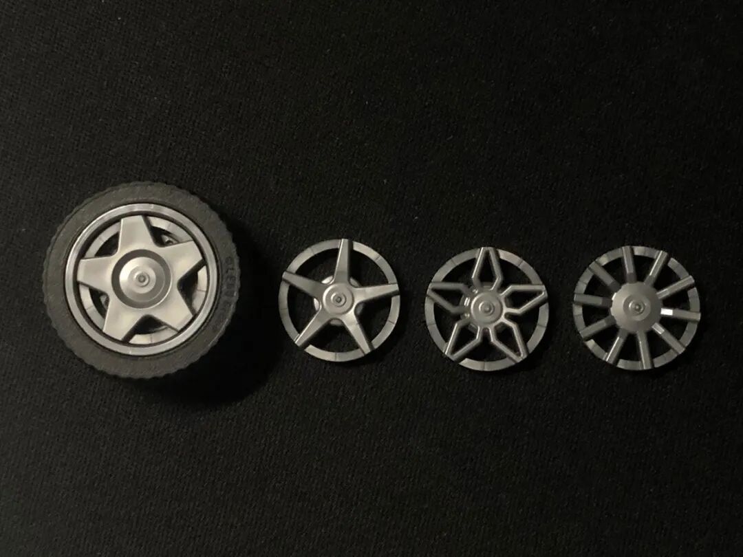 随车附赠一台头戴红色安全帽、身穿法拉利赛车服的小人,以及四种可更换的轮毂(贴心的乐高还准备多一套备用的轮毂,一共给了4袋共32个),其中最左侧的轮毂还原了F40真车采用的原装轮毂。