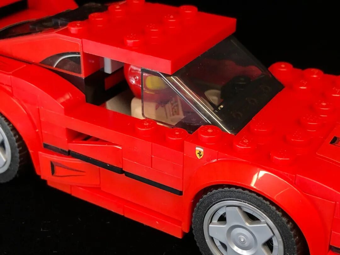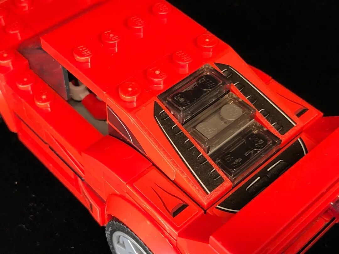 侧面进气口采用一个梯形镂空件刻画,翼子板上的法拉利盾徽为印刷件,也是全车唯一一个印刷件,其余细节皆采用贴纸刻画。这个印刷件也在2020年的76895 法拉利F8 Tributo中出现。
