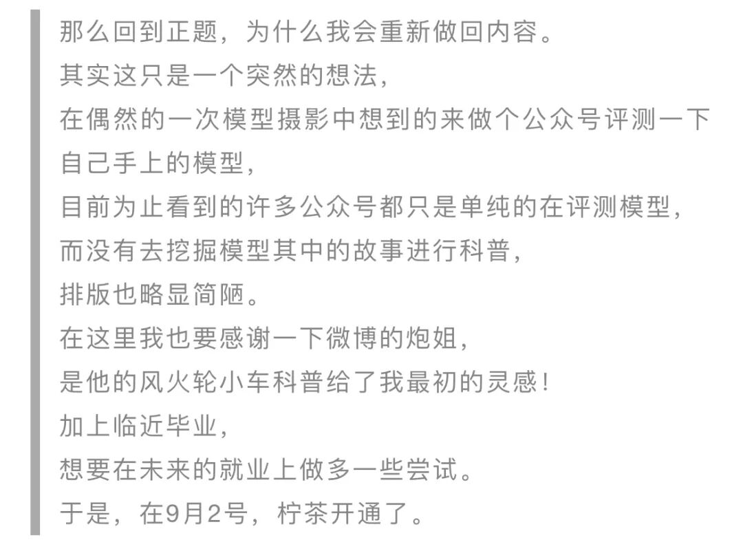 对于我而言,做这个公众号最大的意义,在于传播汽车文化,而不仅仅是把玩评测模型。能够通过把玩模型的同时发掘背后的汽车文化内容,为中国的汽车文化传播贡献自己微薄的力量,就足够了。