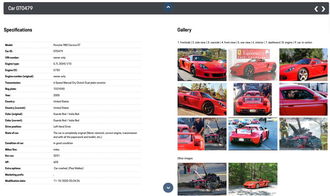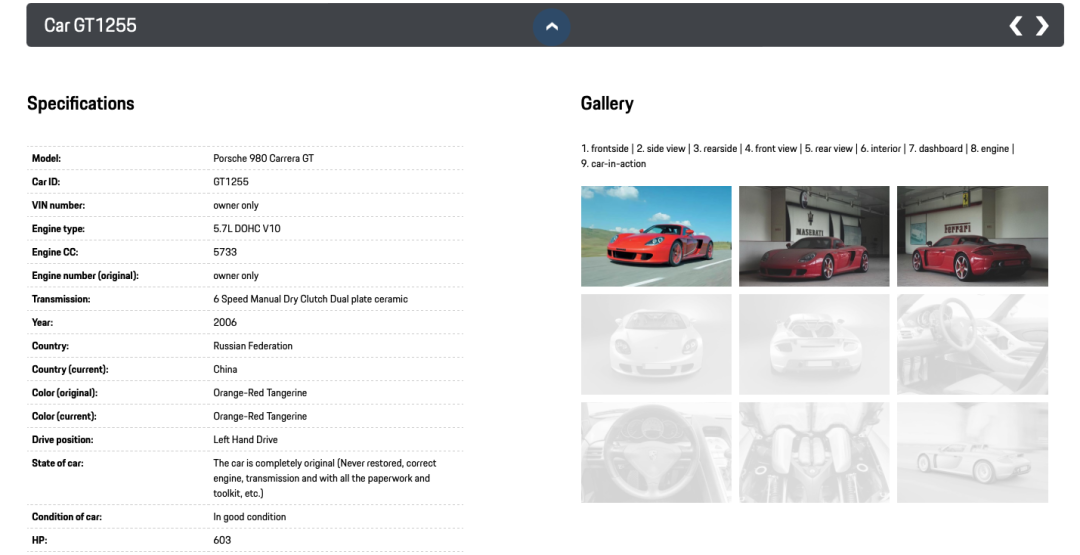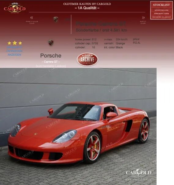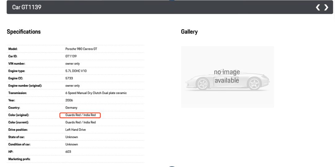 在互联网上有许多保时捷相关的档案馆,如Porscheregister。它们记录了Carrera GT所有1270台的出厂颜色等信息(其实出厂信息是不会有问题的),部分车型还标注了售出地点和最后出现的地方是中国。(这些部分其实是可以被车迷们自行编辑的)。