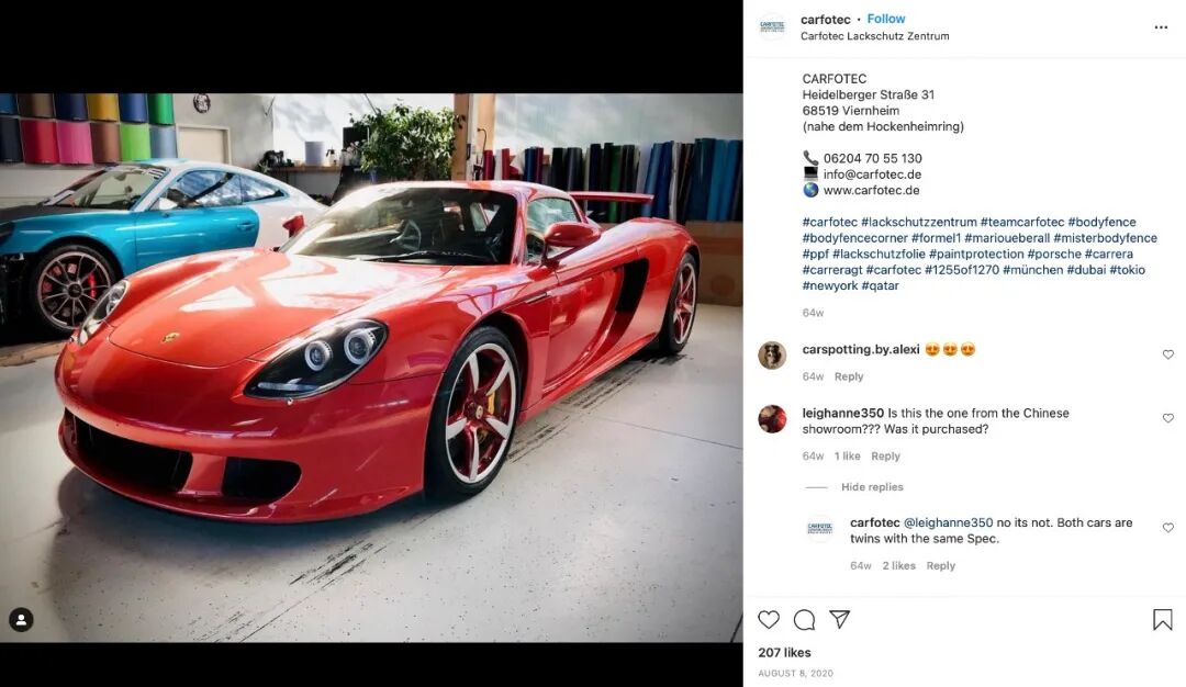 带着疑问,我顺藤摸瓜找到了发布者的ins,这个博主是来自德国菲恩海姆的一个喷漆中心的官方账号,在这个账号中,我发现了更多关于红色Carrera GT的图片,并且博主明确表示这台车就是底盘编号为1255的那台,并且有中控台图片可以证实。