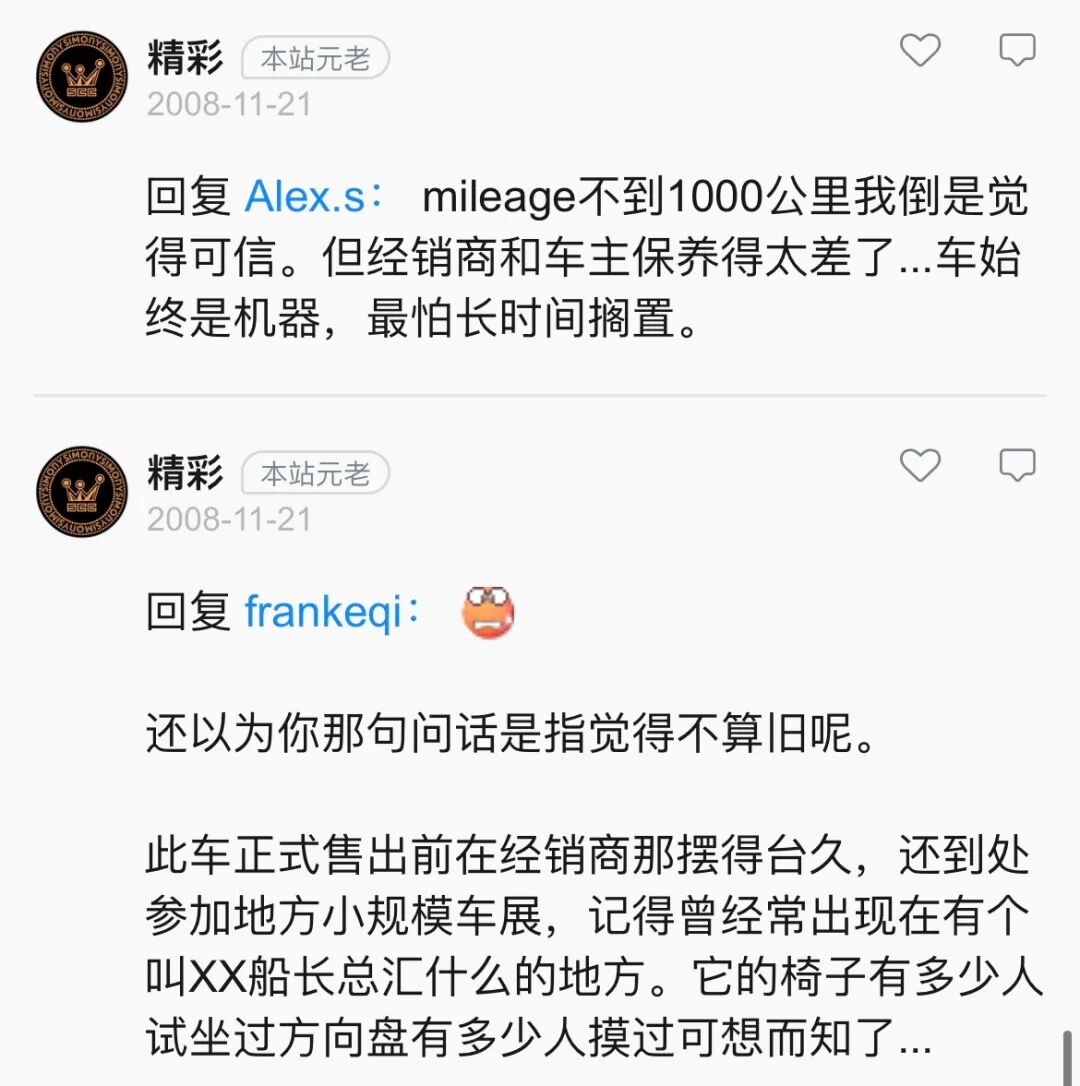 这是精彩哥当时PO出的座椅图片以及评论截图,确实很难想象一台400多公里(2009年1月时为900多公里,依然不到1000公里)的车的座椅居然这么烂,这台车距离出厂也不到3年。