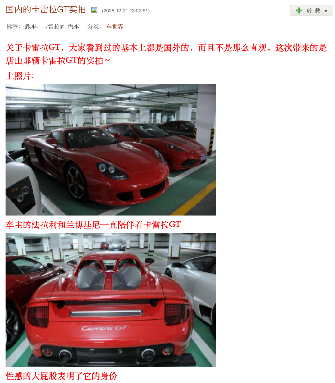2008年10-11月期间(这样时间才对得上),这台车在唐山某地的地下车库被拍到,旁边的430 Scuderia也不是等闲之辈,但在Carrera GT面前真的气场全无。