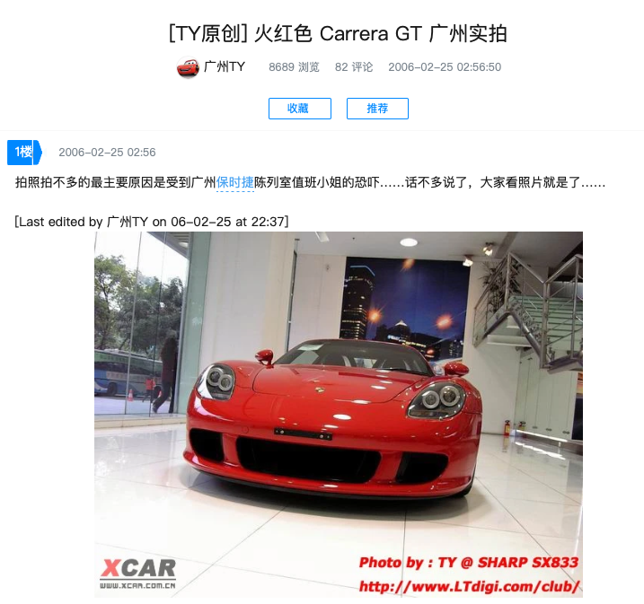 随后我又继续搜索,找到了应该是目前能找到的最早的关于这台正在吃灰的Carrera GT在国内的图片,地点是在广州环市东路的保时捷中心,也就是说这台车是正规进口的新车!