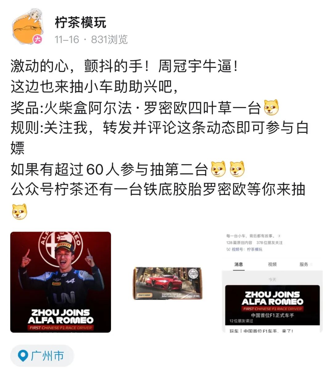 在B站 柠茶模玩 的抽奖动态还有两台火柴盒阿尔法·罗密欧 茱丽叶 四叶草送出喔!只要关注并转发评论即可参与!
