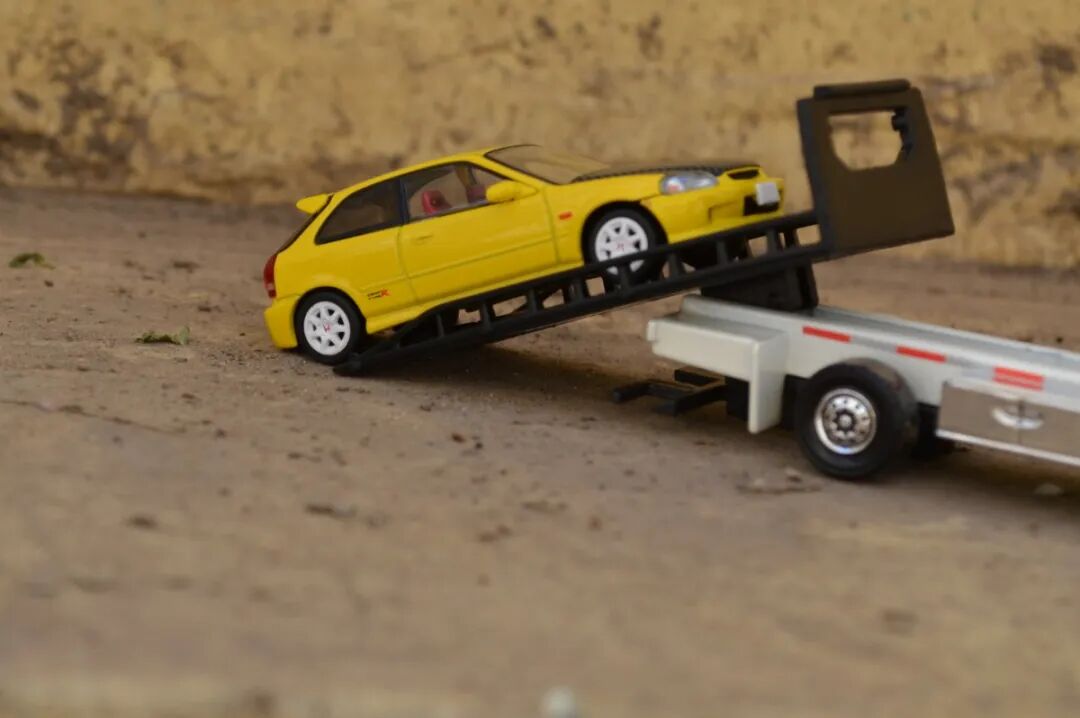 这张图似乎在模拟事故场景,不过火柴盒的平板的伸出角度并不够,TLV的EK9上车时似乎已经磨到底盘了。