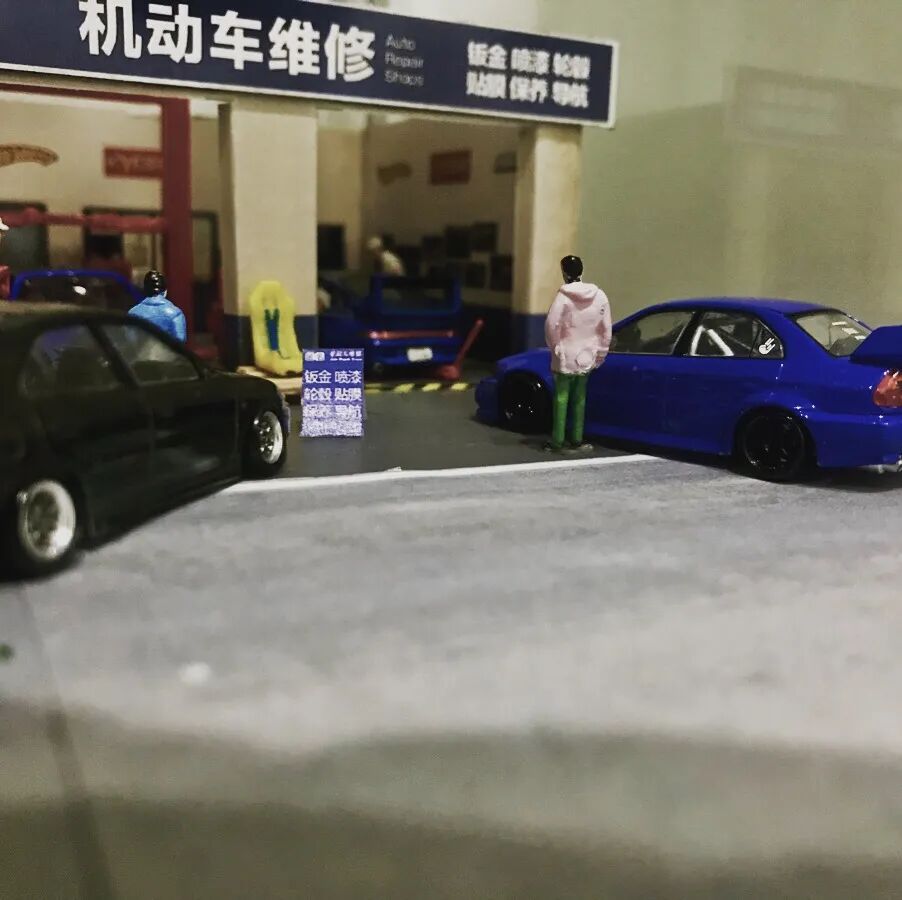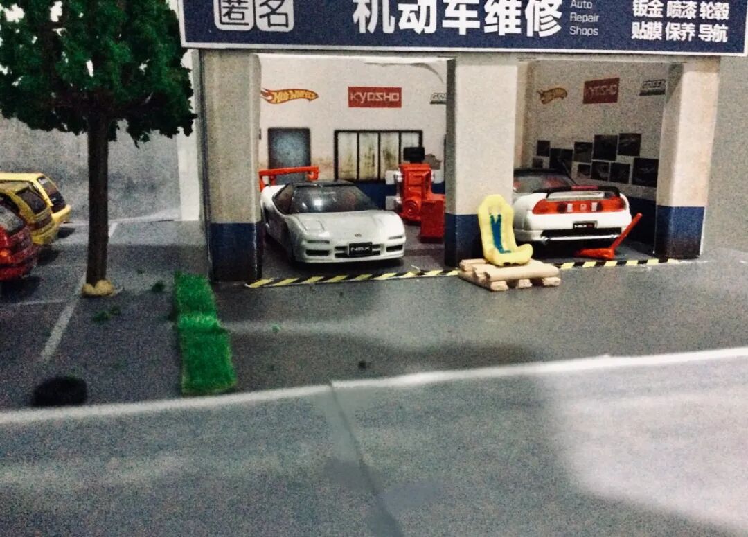这个场景还原了修车厂的情景,而招牌还是中文的。