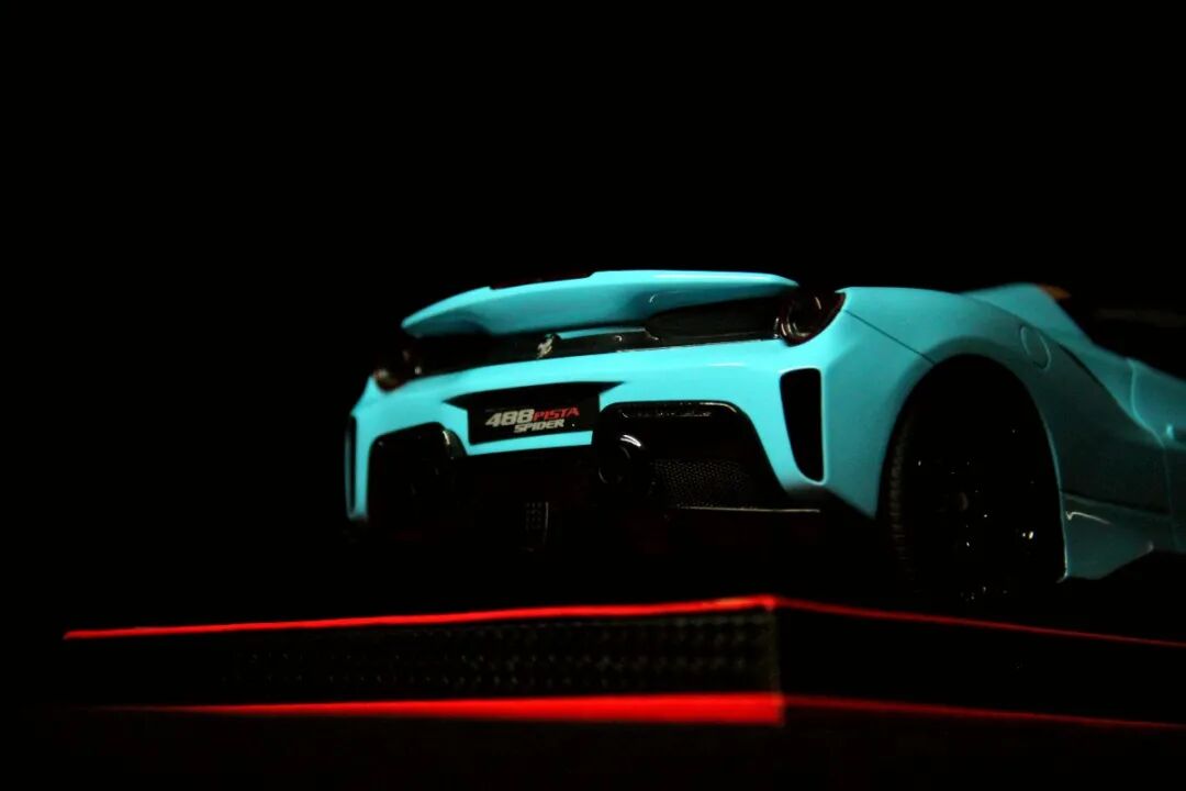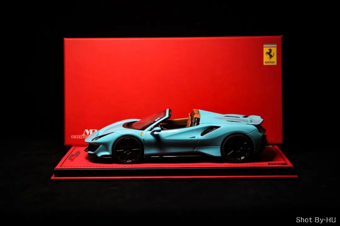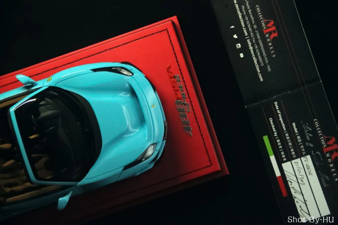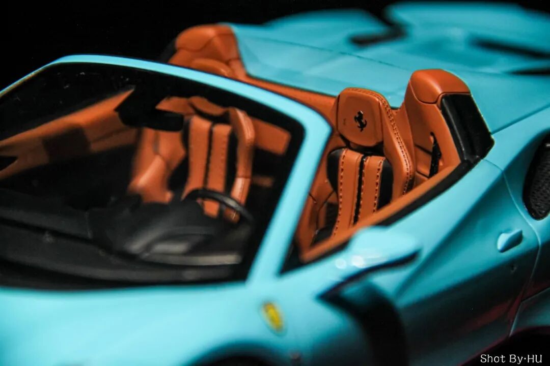 这是一台由MR推出的1:18法拉利488 Pista树脂模型,还是美国经销商AutoBarn限定版!限量10台,此台编号第5。采用了Baby Blue涂装搭配同色卡钳+棕色内饰。这应该是我们柠茶接过的图片中最稀有一台模型了!本期封面就是你了!