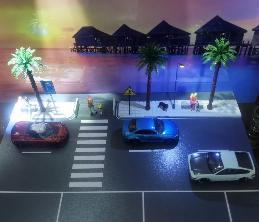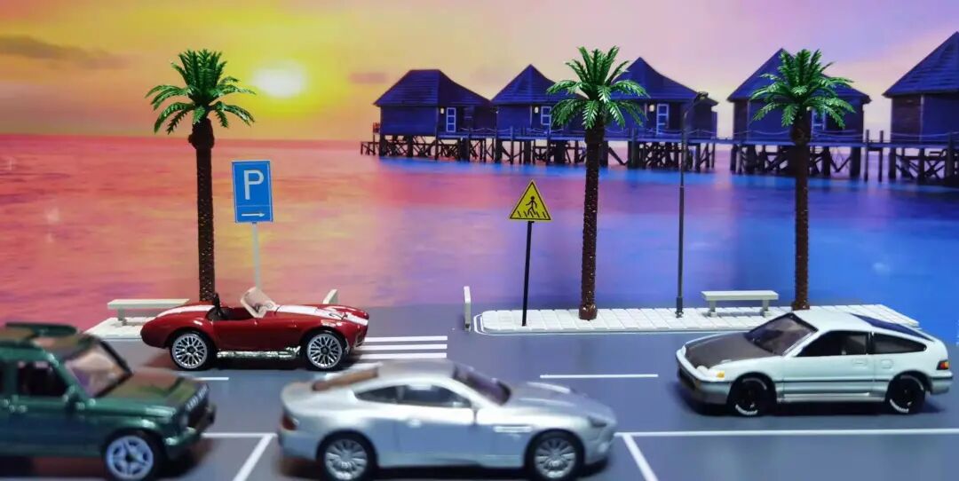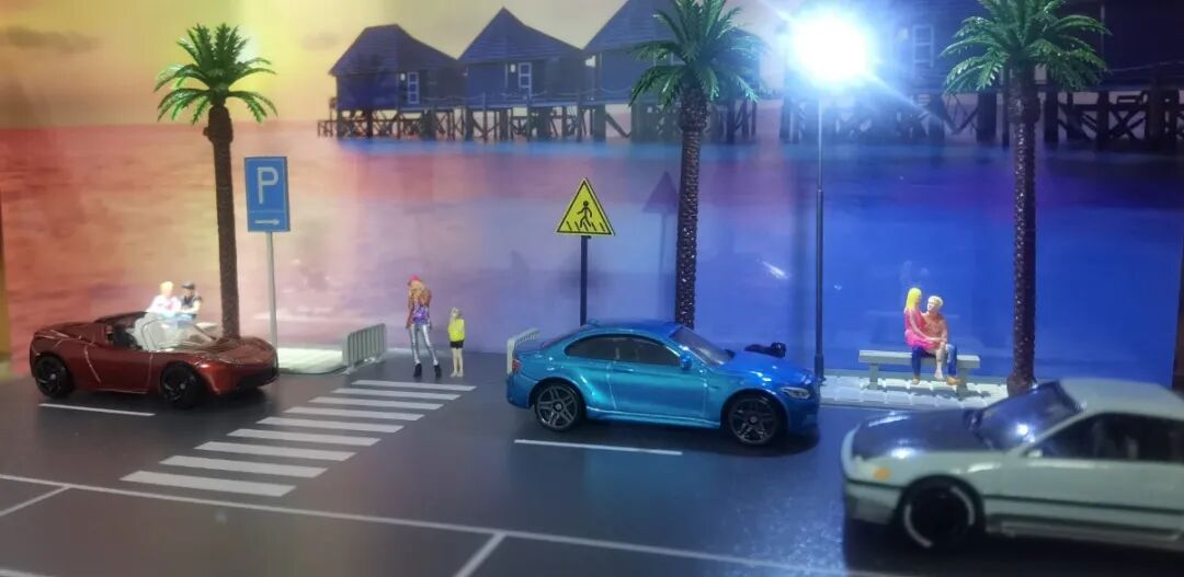 海边永远是浪漫的坐标,一开始玩家购置了场景、搭配了背景画,放上了爱车——但总是觉得缺少些什么,于是又添置了自涂的人偶,热拥的情侣、带娃的辣妈、看手机的夫妻、在皮卡上热舞的年轻人、遛狗的本土居民.... 一切看起来更加生动、有趣,汽车已经不是主角,成为道具和烘托场景的元素。我想收藏小车也是如此,源自生活更源自热爱与执着!