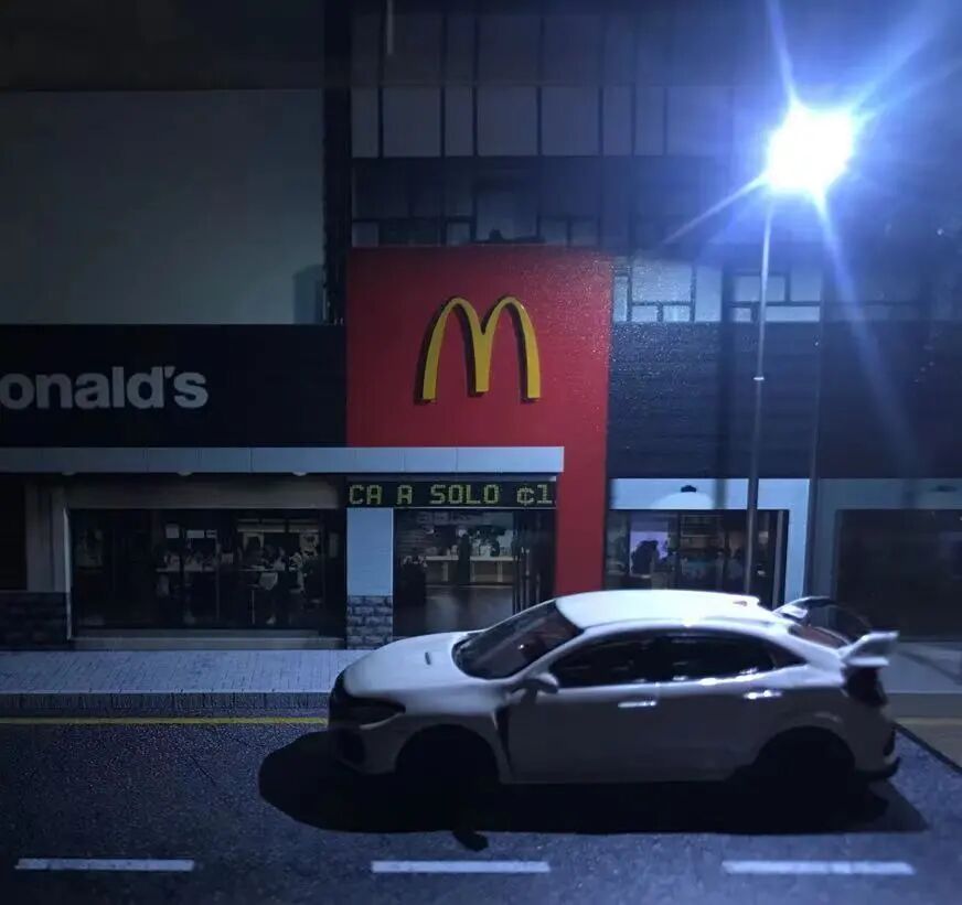 好家伙,这台思域到的时候已经打烊了!但是这个路灯很仿真!