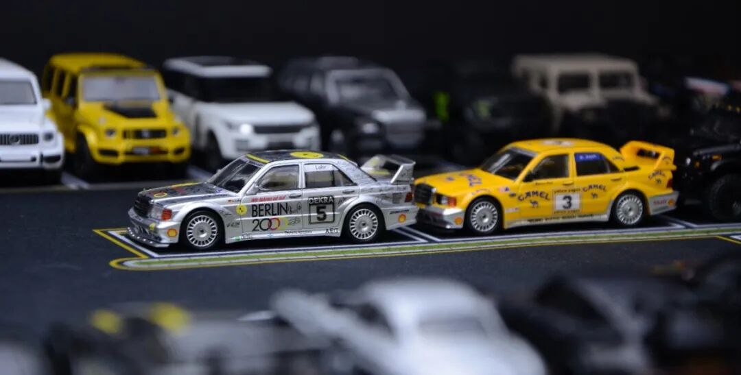 柏林熊涂装和骆驼涂装的MINI GT奔驰190E赛车,个人非常喜欢这个打光!