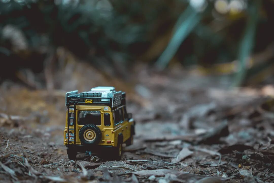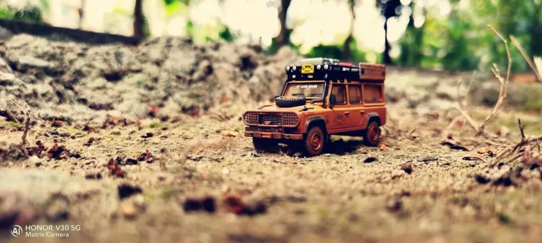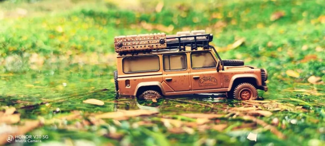作者巧妙地将小车放置于泥地和湿水上,还原了骆驼杯雨林比赛时的场景。