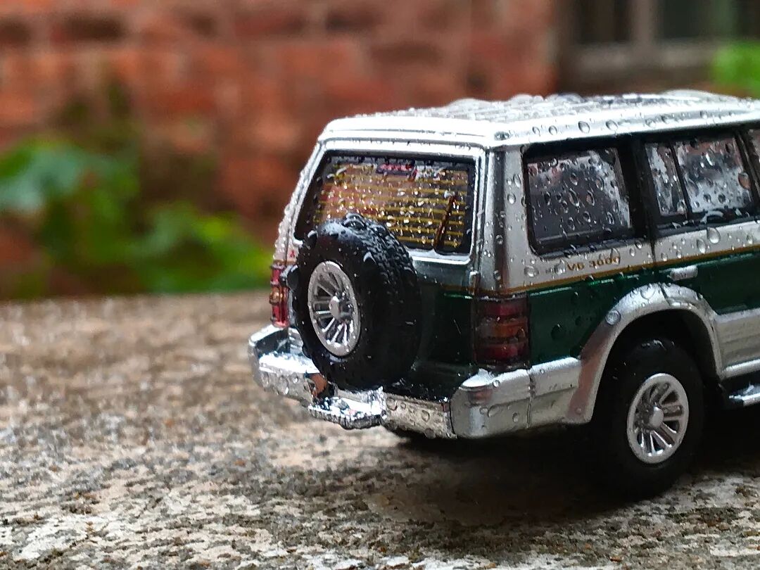 湿透了的PAJERO,其实多了这些水珠让这张照片多了一丝真实感。