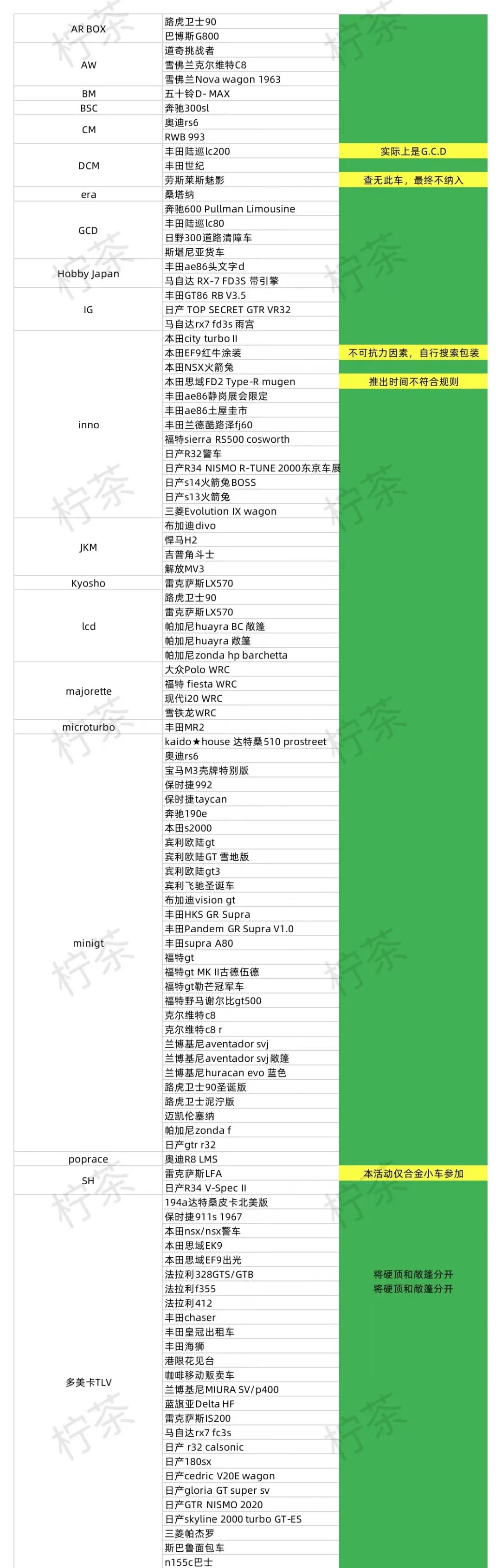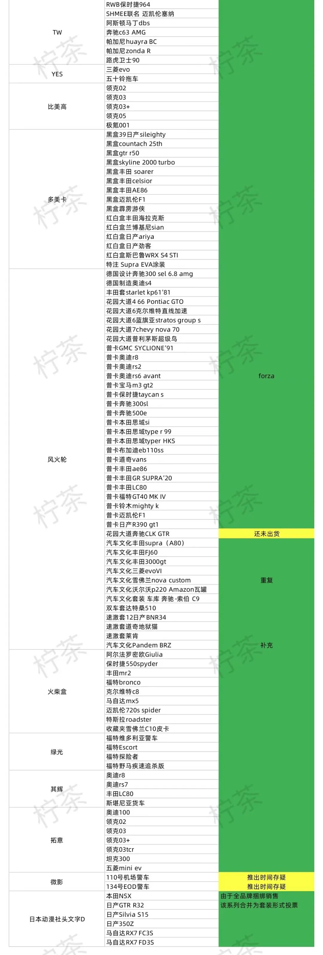 *表中内容补充:经模友提醒,最终将微影2台小车以及风火轮漂移套装中的Pandem BRZ补入投票。