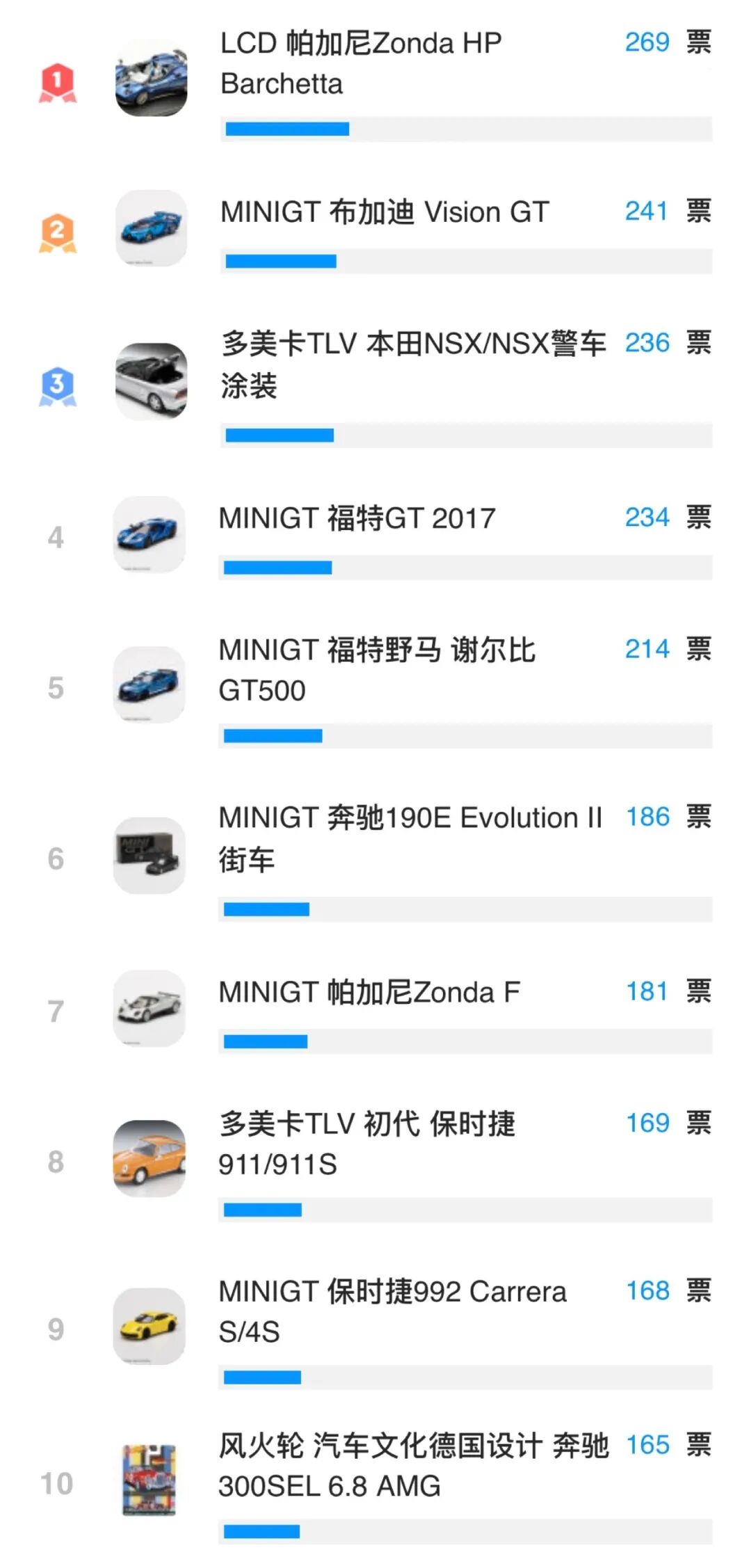 本次投票共有1051人参与。其中,L.C.D的帕加尼Zonda HP Barchetta力压群雄获得了269票,取得了2021年度十大好车的第1名!紧随其后的则是MINIGT推出的布加迪Vision GT,在最后的2天时间里它成功超过了最终位列第三的TLV本田NSX,成为了年度十大好车第2名!