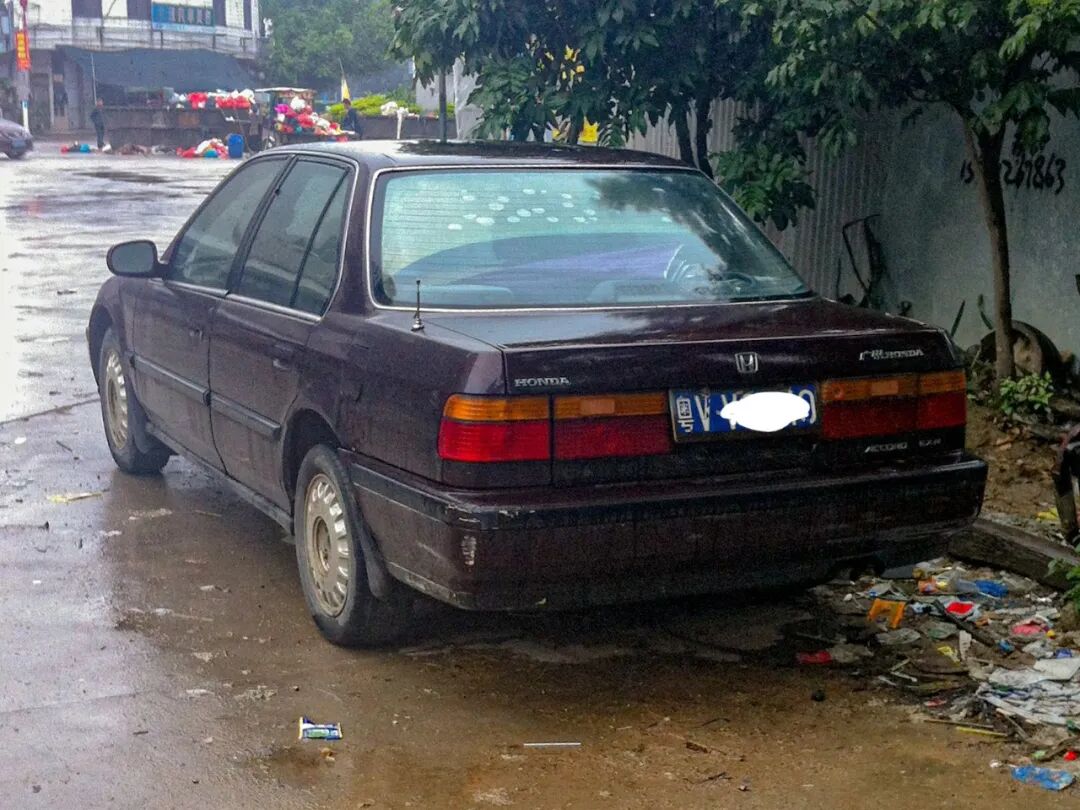 昨晚我在网盘翻了两万张照片后,终于找到了当时拍下的照片,一度以为找不到了,差点就放弃了。七年后再次见到它时,一眼就被我认出了,因为在小镇里这台车的颜色实在太特别,酒红色的四代雅阁似乎也仅此一台,车的一角还贴有进口商广通汽车的贴纸。