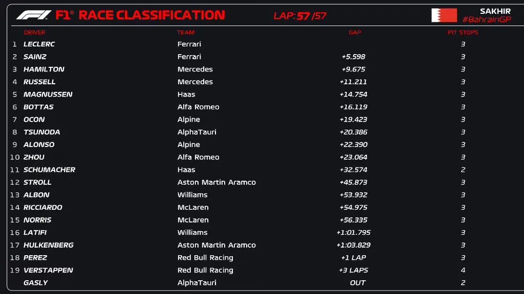 F1巴林大奖赛最终成绩如上图,恭喜勒克莱尔喜提分站冠军!窝法雄起!