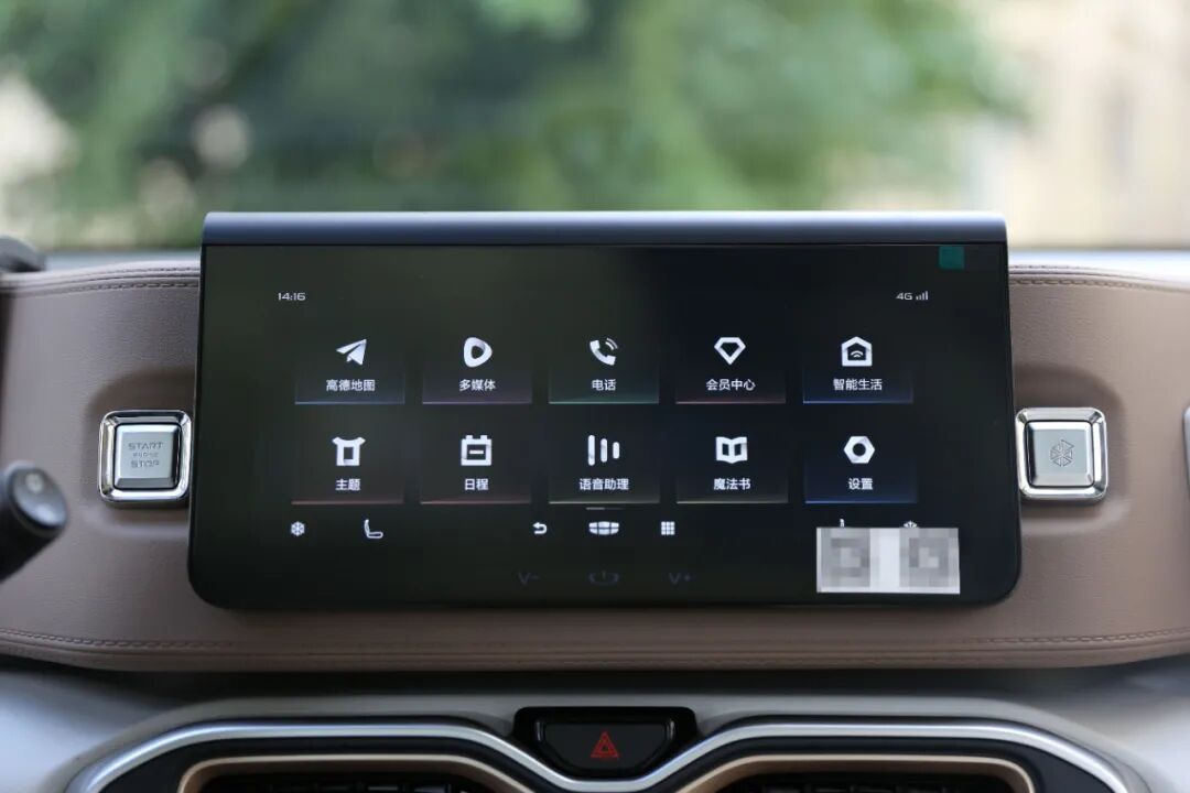 不带“帽檐”的中控屏,不是悬浮式,也不是内嵌式,而是直接“搭在”中控台上方,内部集成的各种功能非常便利,中控屏左侧是启动/熄火按键,右侧是自定义快捷键,可设置“一键导航”等,挺有意思。