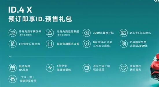 上汽大众ID.4 X共推出5款车型,补贴后售价区间为19.9888-27.2888万元,NEDC续航里程提供三种选择,分别可达402km、520km以及550km。此外,上汽大众针对新车预定提供了终身免费车辆保养、终身免费道路救援、3000元置换补贴、1年免费公共充电、8年或16万公里三电安心质保等13项礼遇,而针对ID.初见版车型官方则推出18重礼遇,需要注意的是,上述权益需要在2021年9月30日前预定才可享受。