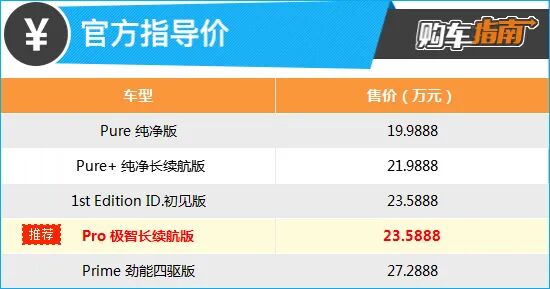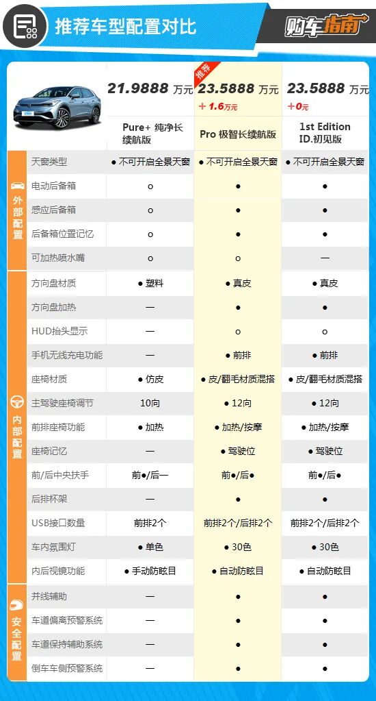 综合配置来看,小编向您推荐Pro 极智长续航版,售价23.5888万元。推荐车型较低一级别车型,外部方面多出了感应电动后备箱和后备箱记忆功能,内部则多出了方向盘加热、座椅按摩、真皮方向盘、10向主驾驶座椅电动调节以及前排手机无线充电功能,而多出的这些配置足以使用车感受提升一个档次,舒适性和便利性均得到了提升。同时,车内氛围灯也由单色升级至30色。更重要的是,推荐车型在安全配置方面更加全面,新增了并线辅助、车道偏离预警系统、车道保持辅助系统以及倒车车侧预警系统等配置。结合售价来看,1.6万元的差价可谓物超所值。