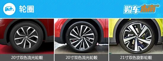 轮胎方面,上汽大众ID.4 X提供19英寸、20英寸以及21英寸三种规格,可选范围较大。同时,新车还提供了三种不同轮圈样式,每一种都十分运动。略有遗憾的是,由于新车刚上市,因此19寸轮圈样式的图片有所缺失。