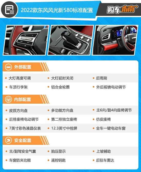 入门车型在内饰用料上与其他配置车型的差别并不大,但在配置上则相差甚远。风光新580虽全系采用了皮质方向盘、多功能方向盘、双联屏设计以及仿皮座椅。不过,入门级车型并没有配备其它车型所拥有的电动座椅调节、无钥匙进入、后视镜加热以及雨量感应器等。此外,对比其它车型配备的360度全景影像系统、全景天窗、方向盘四向调节以及自动空调等,入门级豪华型这些配置上都有不同程度的缩水。