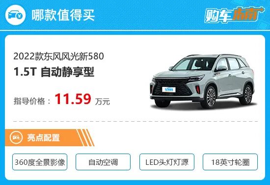 而对于更高一级的次顶配奢享型,虽然价格在推荐车型的基础上又增加了7000元,但增加的配置除前排侧气囊外,大多数都属于进阶型配置,例如:电动后备厢、方向盘换挡、8喇叭以及7色环境氛围灯、前驻车雷达等等,对于一款主打性价比的国产中型SUV,价格便宜实惠才是王道,因此这些锦上添花的配置可有可无。综合来看,如果您近期想购买2022款东风小康风光580,那么1.5T自动静享型车型相对性价比更高,在购车时可优先考虑。