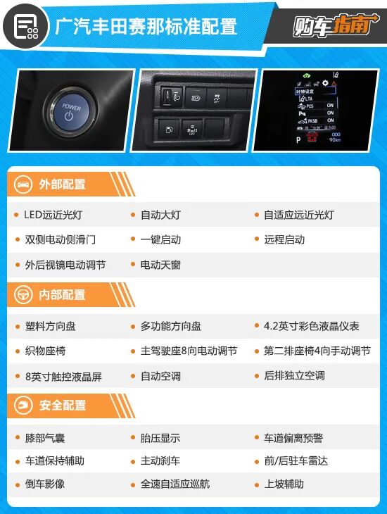 作为赛那SIENNA全系的入门车型,舒适版在驾驶辅助和灯光系统方面表现出色,配备了实用性较强的全速自适应巡航、前后雷达、倒车影像、自动大灯、自适应远近光灯等功能,为日常泊车以及夜晚行车安全提供帮助。不过,在家庭消费者看中的舒适性方面,入门车型还有较大提升空间,主要体现在方向盘和座椅材质,以及前后排座椅功能上。例如方向盘仅为塑料材质,座椅也采用的是普通织物面料,并且只提供了主驾驶座椅电动调节,驾乘体验一般。另外,在日常使用频率较高的多媒体和外后视镜方面,入门车型也有所欠缺,8英寸触控屏不仅尺寸较小,功能上相比高配车型也少了在线导航、智能语音控制、车联网、OTA升级等,外后视镜仅支持电动调节,没有配备加热和折叠功能。从价格来看,入门车型的指导价依然达到了30.98万元,考虑到其在舒适性配置上的缺失,性价比并不高。