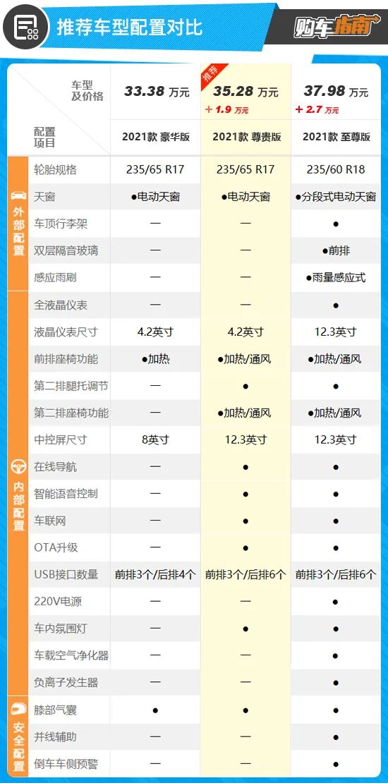 纵观赛那SIENNA全系车型配置,编辑更加推荐中配车型尊贵版,推荐车型在延续此前豪华版较高配置水平的同时,特别针对前后排座椅功能和多媒体系统进行了升级,前排座椅增加了通风功能,第二排座椅支持电动调节、腿托调节以及加热/通风等功能,前后排乘坐舒适性均得到了大幅提升。中控屏尺寸升级到12.3英寸,并且提供了实用的在线导航、智能语音控制、车联网、OTA升级一系列功能,日常使用更加便利。只需多花1.9万元便能得到如此丰富的配置,显然尊贵版的性价比更高。