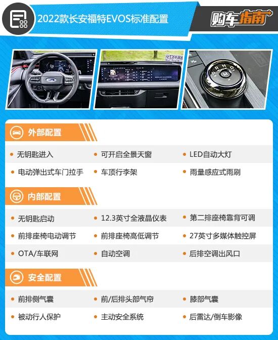 2022款长安福特EVOS由于入门的科技版车型配置尚未公开,所以此次的标准配置将参考次低配风尚版车型。从配置的丰富程度来看,风尚版车型已经达到了同级别车型中配甚至高配车型的水准,甚至还提供了电动弹出式车门把手、多项主动安全配置以及膝部气囊等多项越级配置,表现足可以令人满意。
