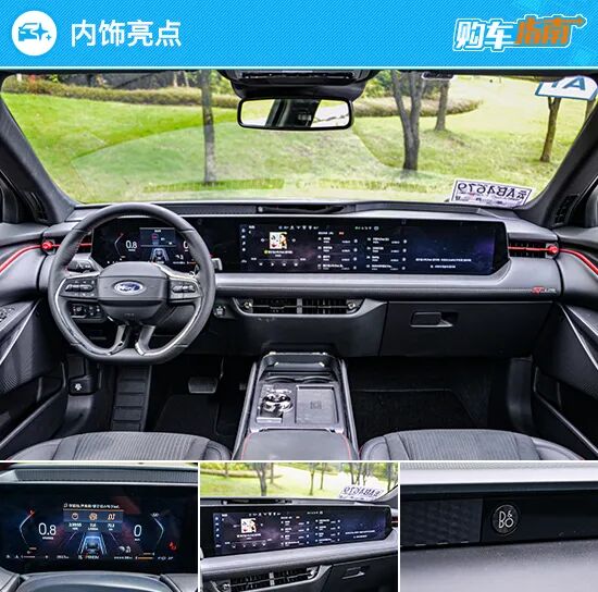 内饰方面,福特EVOS采用了与以往截然不同的设计,科技氛围直接拉满,如果说这是一台电动车也毫无违和感。首先映入眼帘的绝对是长度达到1.1米的悬浮式“双联屏”,其中12.3英寸全液晶仪表分辨率可达2K,而27英寸多媒体触控屏分辨率更是高达4K,加之高通骁龙820A车规处理器的加持,表现甚至比部分平板电脑都要出色。同时从中配车型开始,就提供10扬声器的B&O音响系统,配合多媒体系统,能够为前排乘客提供真正堪比影院的影音享受。