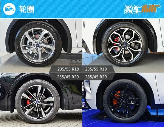 福特EVOS提供了四种尺寸轮圈,除科技版和风尚版两款低配车型外,其余车型均配备了红色刹车卡钳。轮胎方面,风尚版和运动版具体尺寸均为235/55 R19,而ST-Line和首发限量版则均为255/45 R20。其中,ST-Line和首发限量版的轮圈样式其实一样,只是配色不同,前者为镀铬与高光黑色钢琴漆混搭风格,后者为全黑。