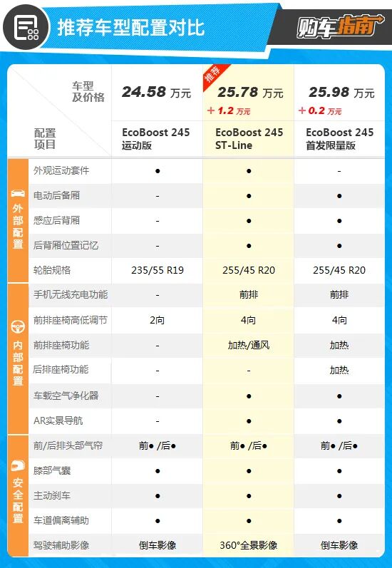 所以综合来看,2022款长安福特EVOS EcoBoost 245 ST-Line版车型较为更值得推荐,而比它高出2000元的顶配首发限量版仅增加了后排座椅加热,但取消了前排座椅通风,同时还没有配备ST-Line外观运动套件,考虑到这款车相对年轻的受众,显然前排使用率更高,而且对于外观性能感这件事,年轻人必然有着强烈的执念,所以这2000元完全可以省下来,不是舍不得,而是真没必要。