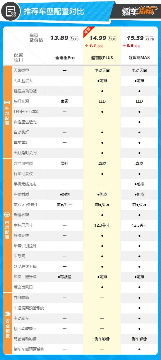 从配置来看,小编更倾向推荐中配车型,也就是售价14.99万元的超智联PLUS版。相较于入门版车型,推荐车型在外部多出了无钥匙进入、自动头灯、大灯延时关闭等便利性功能,并且灯源也由卤素升级至LED。内部则多出了真皮方向盘、仿皮座椅、后排中央扶手以及后座出风口等,大幅提升了乘客舒适度,同时还配备了12.3英寸中控屏,内部支持丰富的互联功能。此外,安全配置还新增加了倒车影像,更便于驾驶者完成倒车入库等动作。上述新增配置仅需多花费1.1万元就可获得,性价比极高。