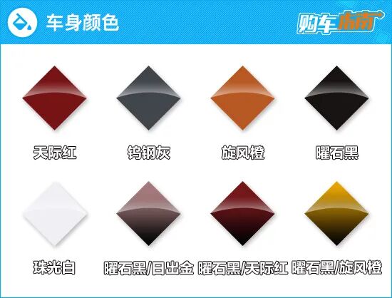 车身颜色方面,新车提供天际红、钨钢灰、旋风橙、曜石黑、珠光白五种单色配色,同时还提供曜石黑/日出金、曜石黑/天际红、曜石黑/旋风橙三种双色配色,视觉效果更加时尚。
