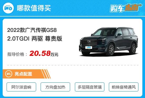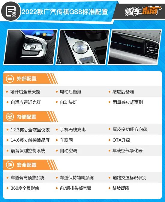 作为广汽传祺旗舰SUV,第二代GS8在标准配置方面表现令人满意,且入门车型就已经非常丰富了,例如电动感应后备箱、远程启动、自适应远近光灯都有所配备,同时内部的语音控制、车联网、12.3+14.6英寸大屏、自动空调等也满足了我们日常使用。除了上表中的配置外,前排座椅加热、主副驾驶电动调节、PM2.5过滤均为全系标配。从其18.68万元的售价来说可以说非常超值,如果加上后期优惠的话,那么入门版车型也是个很好的选择。