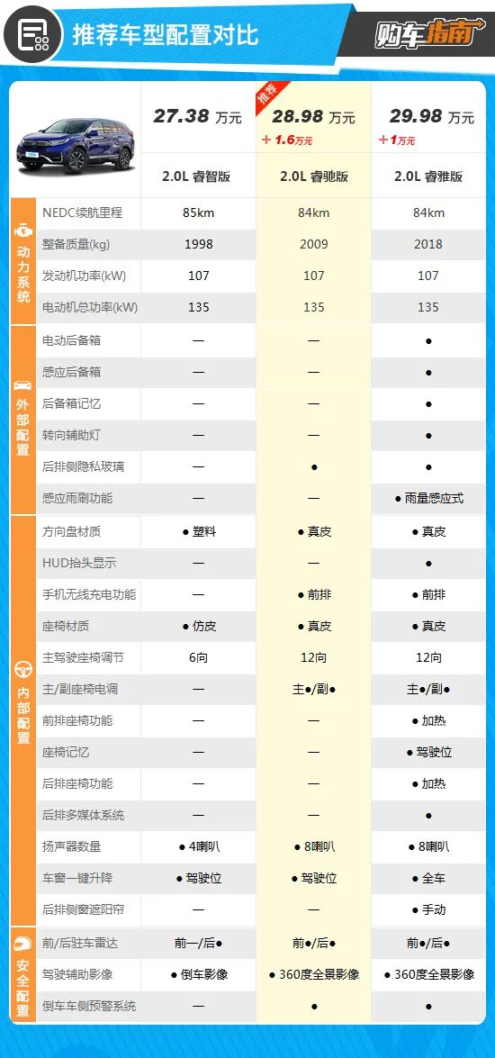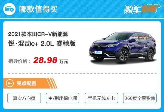 顶配车型虽然独享感应电动后备箱、转向辅助灯、雨量式感应雨刷、HUD抬头显示、前排座椅加热/记忆、后排座椅加热以及后排手动侧遮阳帘等配置,便利性也有所提升,但综合29.98万元的售价来看,性价比不高。所以综合来看,如若您正在关注东风本田CR-V锐·混动e+车型,那么2021款2.0L 睿驰版值得您优先考虑。
