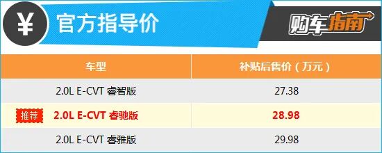 综合配置来看,小编向您推荐中配车型,也就是2.0L 睿驰版,补贴后售价为28.98万元。推荐车型较入门版车型外部多出了后排侧隐私玻璃,保障了后排乘客私密性,而其主要差别则在于内部配置方面,推荐车型较入门版车型多出了真皮方向盘、真皮座椅、主/副驾驶座椅电动调节、前排手机无线充电以及12向主驾驶座椅调节,舒适性方面提升了一个档次。安全配置方面则进一步补强,多出了前驻车雷达、360度全景影像以及倒车车侧预警系统,售价方面多出了1.6万元,性价比较高。