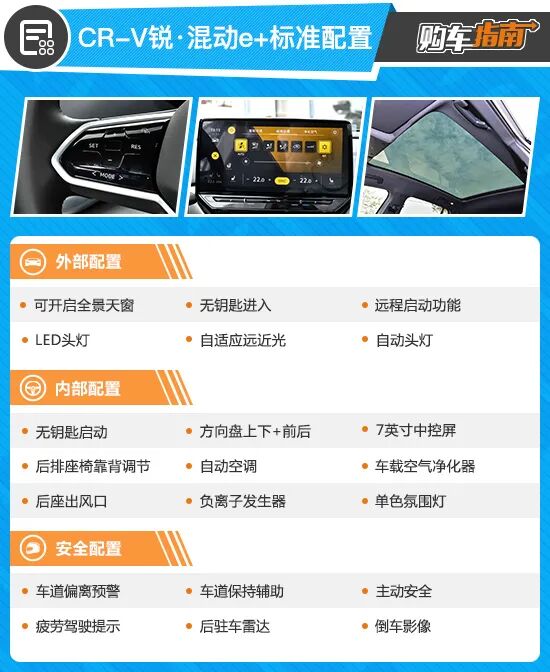 东风本田CR-V锐·混动e+入门版车型配置方面有值得夸赞,但也有不足的地方。具体来看,入门版车型外部配备了消费者喜闻乐见的可开启全景天窗,还配备了无钥匙进入、远程启动、自适应远近光以及自动头灯等便利性配置。内部则配备了无钥匙启动、后排座椅靠背调节、自动空调、后座出风口以及方向盘上下+前后调节等配置,同时还配备了单色氛围灯,提升了车内时尚氛围。安全配置方面,入门车型表现同样较为厚道,配备了车道偏离预警、车道保持辅助、主动安全、疲劳驾驶提示、后驻车雷达以及倒车影像等。
