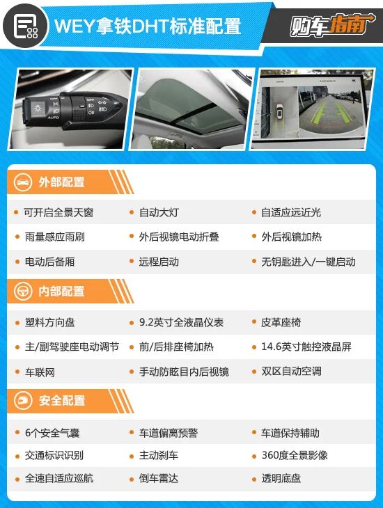 拿铁DHT全系入门车型为售价15.98万元的1.5T DHT中杯,价格相对于同级别自主品牌车型略高,不过整体配置水平也令人满意。首先,在影响驾驶安全的气囊数量、辅助系统以及雷达影像方面,入门车型基本与中高配车型保持一致,仅缺少了并线辅助、前雷达、车侧预警、自动泊车等功能,对于日常使用影响不大。其次,在便利性方面,入门车型的表现也是可圈可点,像常用的无钥匙进入+一键启动、电动后备厢、前排电动座椅、自动大灯、车窗一键升降、感应雨刷以及自动空调等均没有缺席,完全可以满足日常使用需求。不过,入门车型在影响驾乘舒适性的方向盘/座椅材质、座椅功能和空调配置方面存在明显不足,其中方向盘采用塑料材质,座椅也为皮革面料,并且仅提供了座椅加热功能,空调则缺少了实用的空气净化装置和负离子发生器。考虑到本身较高的定价,以及在驾乘舒适性配置方面的缺失,不建议消费者选择入门车型。