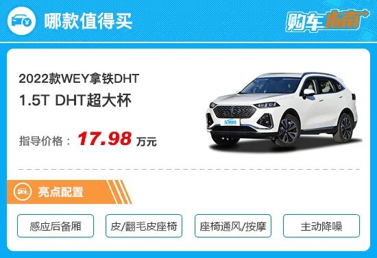 相比而言,编辑更加推荐售价为17.98万元的高配车型1.5T DHT超大杯,相比入门车型仅仅贵了2万元,却拥有非常全面的舒适性配置和智能科技装备。推荐车型在延续中配车型丰富智能科技配置的基础上,增加了生命体征监测,并且配备了便利性出色的感应后备厢、外后视镜倒车自动下翻/记忆功能。此外,在彰显豪华定位和驾乘质感的舒适性方面,推荐车型提供了带加热功能的真皮方向盘、主动降噪、皮/翻毛皮混搭材质座椅以及座椅通风/按摩/记忆等配置,还配备了12个扬声器的Infinity燕飞利仕高级音响,用车体验进一步提升。结合2万元的差价、更为丰富的智能化科技以及周全的舒适性配置来看,价格相对合理且配置水平出色的1.5T DHT超大杯在拿铁DHT全系车型具有更高的性价比优势,购买时建议优先考虑。