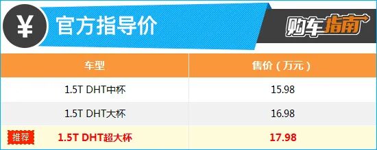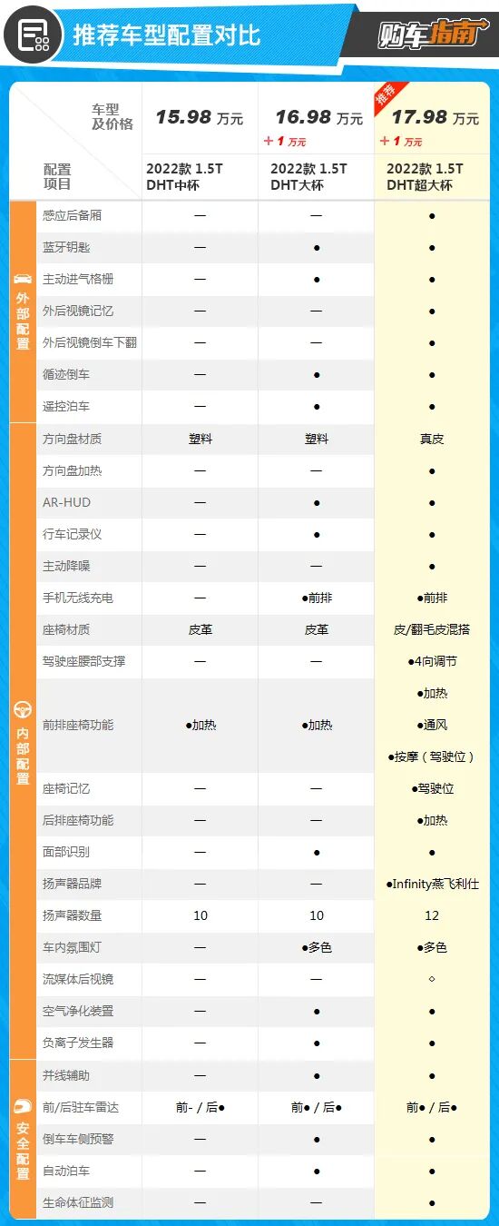 中配车型1.5T DHT大杯售价为16.98万元,增加的配置主要集中在主动安全和智能科技功能方面,包括并线辅助、自动泊车、蓝牙钥匙、AR HUD、面部识别、遥控泊车等,同时还补齐了入门车型在空调配置方面的短板,不过在方向盘/座椅材质和座椅功能方面仍然没有提升,同样不建议考虑。