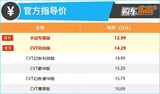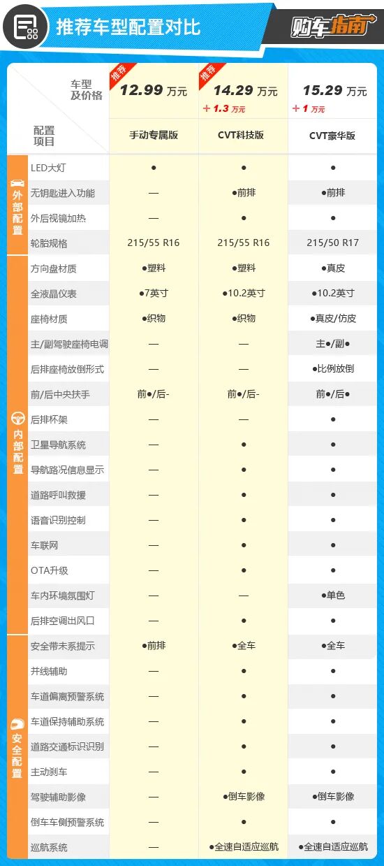 除入门的手动挡车型外,其实自动挡版本的情况也是低配“更香”。如果作为一般家用购车,那么售价为14.29万元的CVT科技版就非常值得推荐。对比来看,推荐车型比手动专属版贵了1.3万元,配置方面除了CVT变速箱外,还增加了倒车影像、10.2英寸全液晶仪表、导航、语音识别控制、车联网、OTA升级、后排空调出风口以及一众主动安全系统,对于绝大部分人来说,它的配置表现已然足够,算是性价比非常高的一个版本。