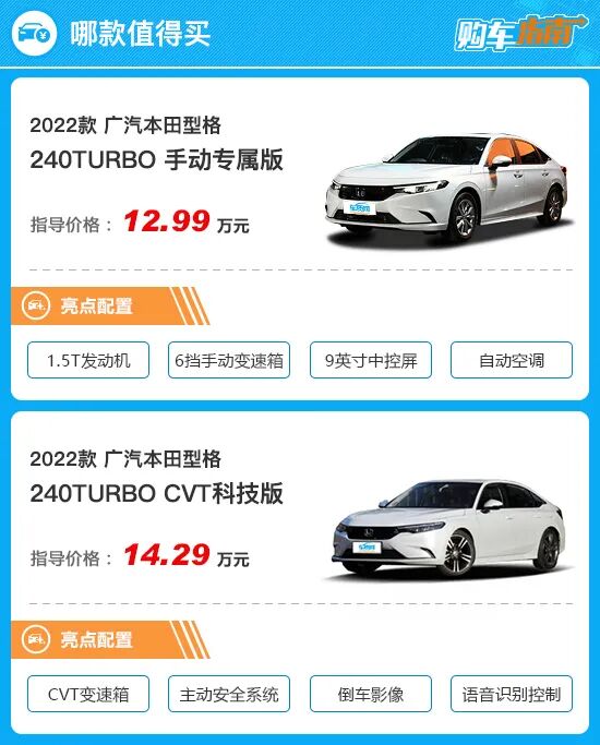 2022款广汽本田型格共推出6款配置车型,售价区间为12.99-16.69万元。新车全系均搭载1.5T四缸涡轮增压发动机,传动系统提供6挡手动和CVT变速箱可选。作为一款极具运动风格的紧凑型轿车,能够提供手动变速箱属实不易,虽然只是入门车型且配置很低。但是这对于那些真正热爱驾驶的消费者而言,已经算是莫大的安慰了,在这一点上,完胜思域。