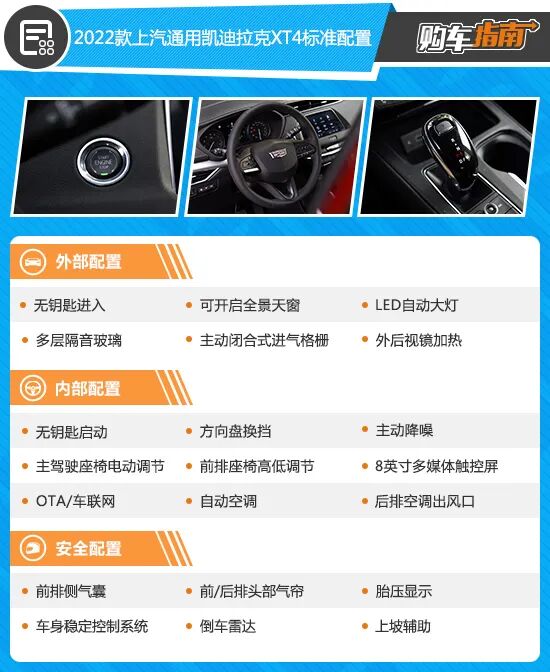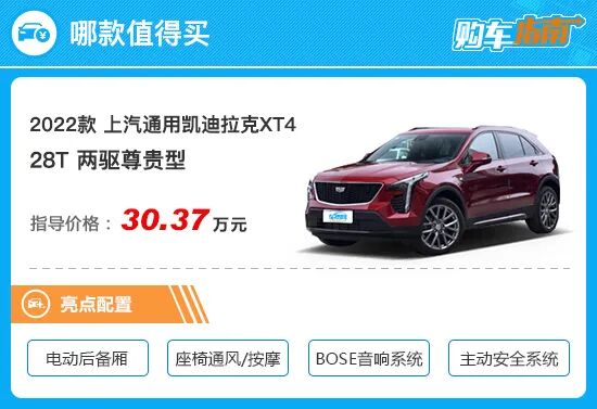 2022款上汽通用凯迪拉克XT4的入门版车型配置表现较高,基本达到了普通家庭的用车需求。同时,如主动降噪、前排多层隔音玻璃、主驾驶座椅电动调节以及主动闭合式进气格栅等高阶配置,在豪华品牌紧凑型SUV的入门版车型上并不多见。唯有遗憾的是入门版车型在外观上与其它版本车型有所差异,前/后包围少了哑光银色装饰,让人一眼就能看出这是一款低配车型,所以不太符合大部分购买豪华品牌消费者的初衷,故不推荐。